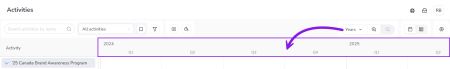 The Timeline display mode provides an overview of your activities in a calendar-style timeline. Activities are represented on the timeline as horizontal bars based on their in-market dates, with today's date marked by a vertical green line: