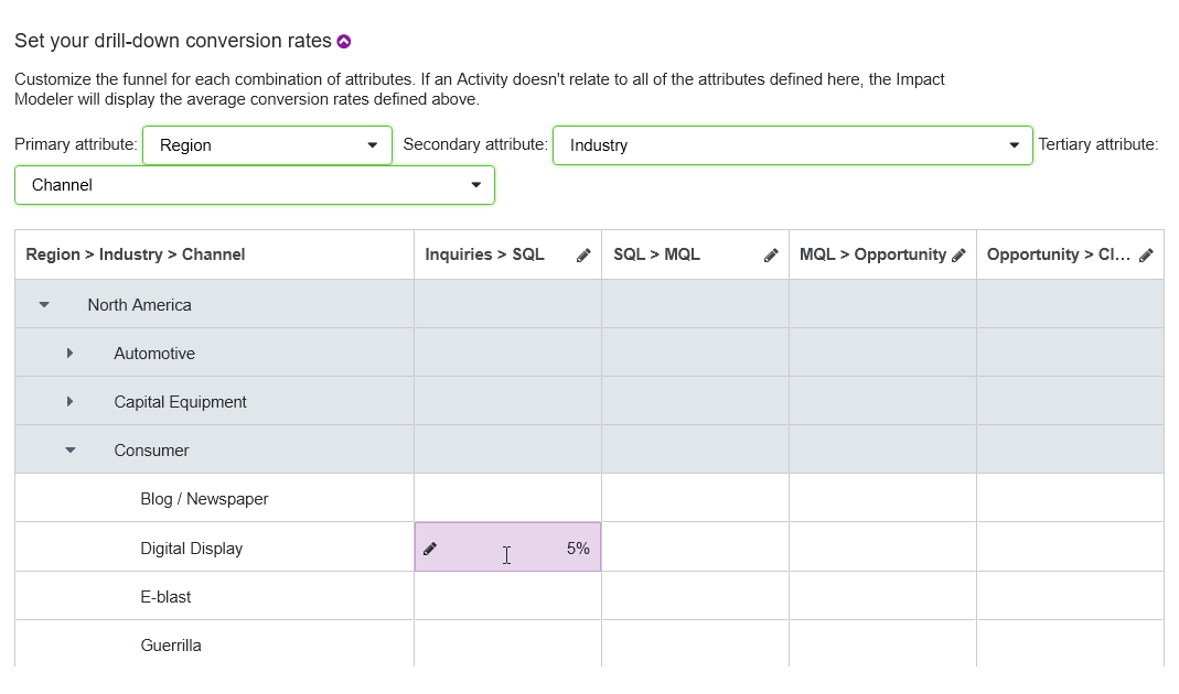 1. On the Impact Modeler Setup page, click the section Set your drill-down conversion rates to expand it.