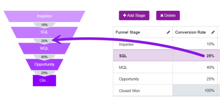 • Under the Conversion Rate column, click on a row to edit the conversion rate. Enter the conversion rate (as a percentage) from the selected stage to the next stage, then click anywhere outside of the field to finish editing. The new rate you set is immediately reflected in the funnel diagram.