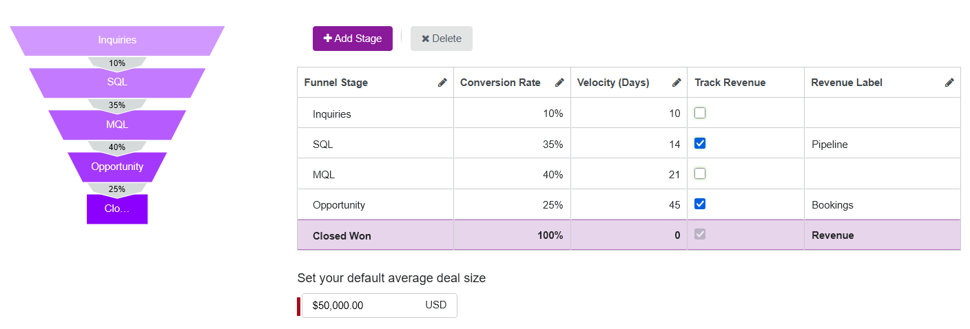 2. Use the funnel stage configuration table to set the default conversion rates and velocities.