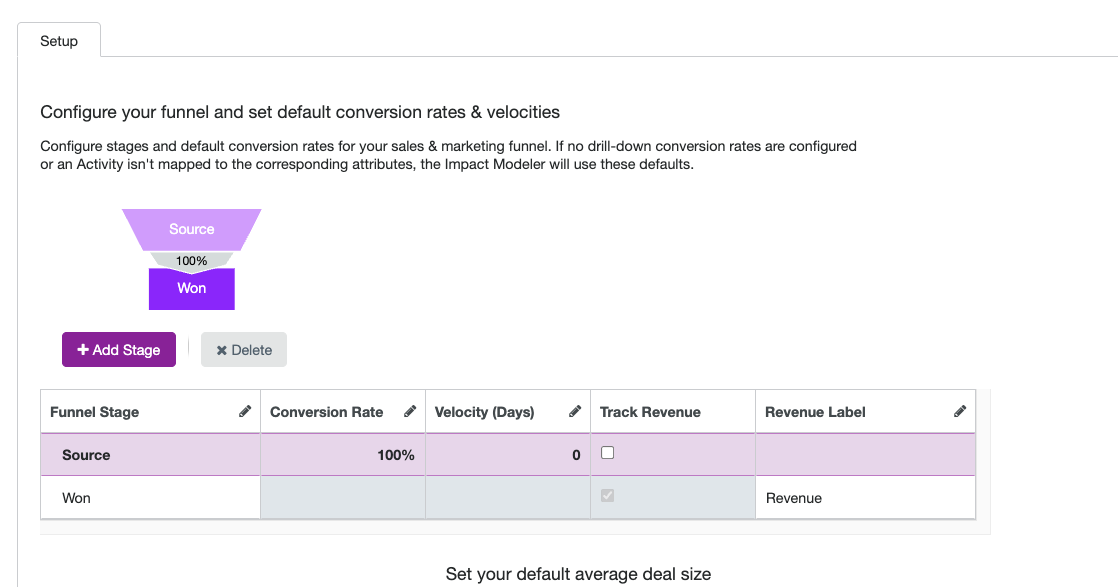 The first step in configuring the Impact Modeler funnel is to set up the stages of the funnel. By default, the funnel starts with only two stages: Source and Won.