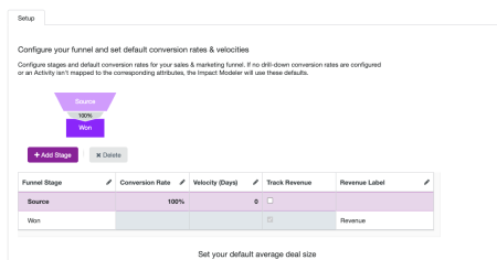 After you have set up the stages of your funnel, the next step is to define the average stage-to-stage performance and deal size that Impact Modeler uses to generate revenue projections. There are three metrics you need to define: