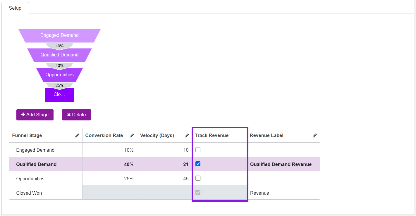 2. To enable revenue tracking for a stage, select the checkbox in the Track Revenue column for that stage: