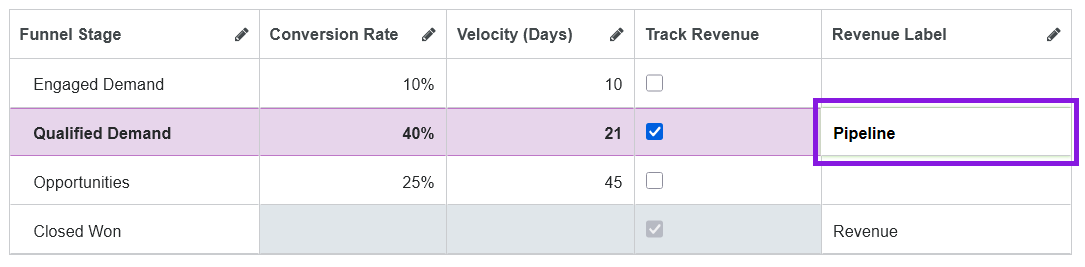 When you turn off revenue tracking for a stage, any custom label set in the Revenue Label column is also removed, and is not restored if you turn Track Revenue back on again for the funnel stage later.
