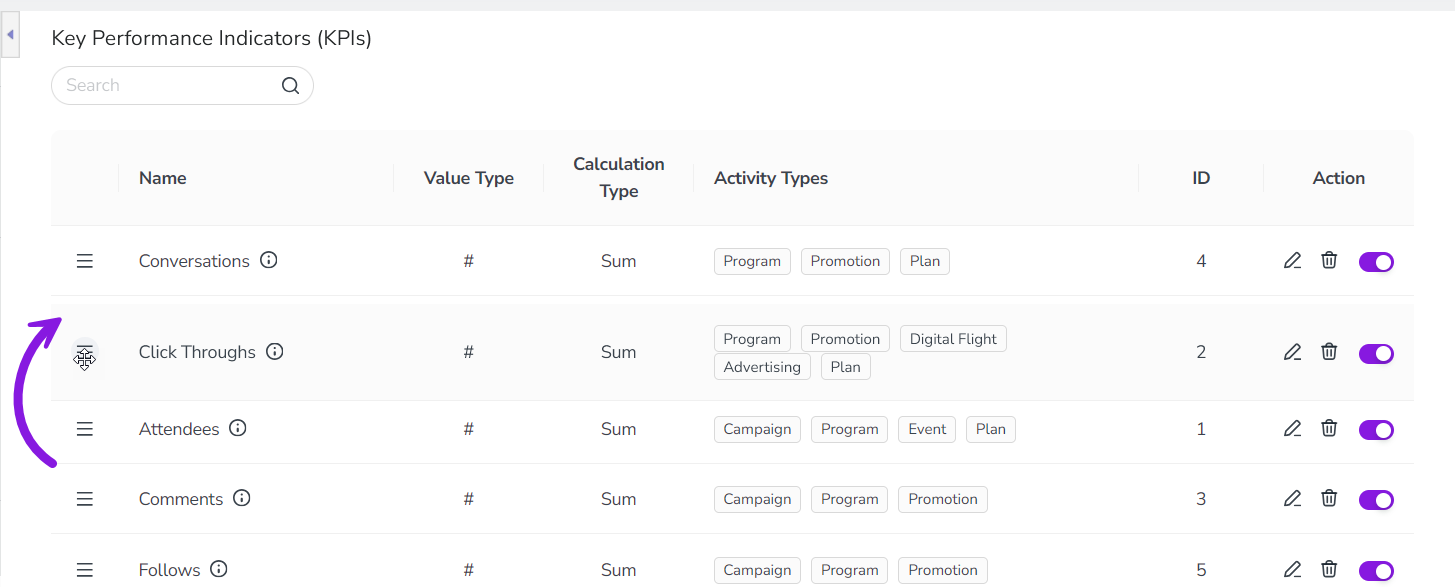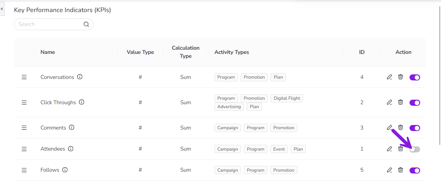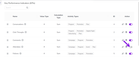 If you want to start tracking a deactivated KPI again, you can reactivate it at any time. To do this, follow the steps for deactivating KPIs, then switch the deactivated KPI's Activate/Deactivate KPI toggle (in the Action column) back to the on position (purple). The reactivated KPI will immediately be displayed again on all activities of the activity types that it is linked to.