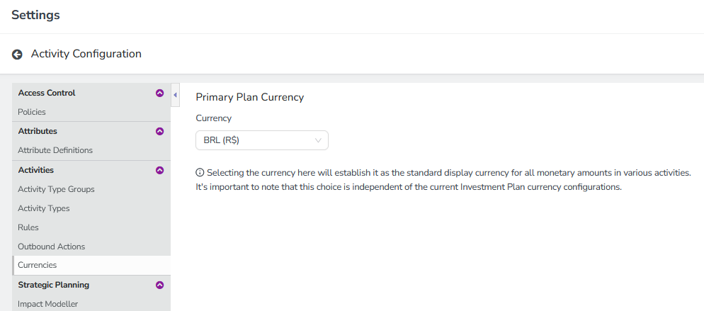 It is possible to define a different primary currency for activities. All activity amounts are shown in the selected primary currency.