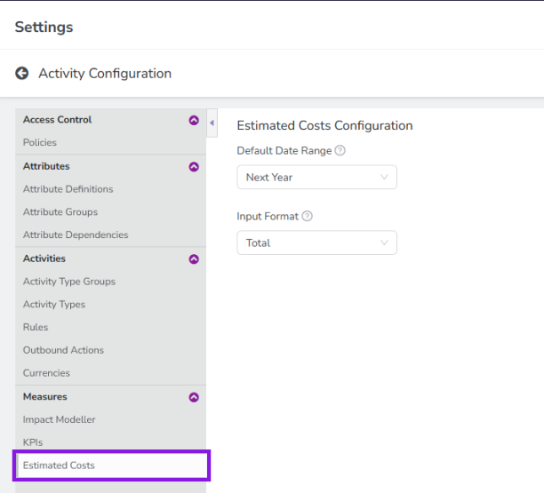 Use the settings under Estimated Costs Configuration to customize how the Estimated Costs feature works in your Uptempo instance.