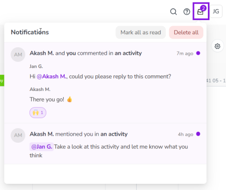 Click on a notification to go directly to the Comments panel on the relevant activity.