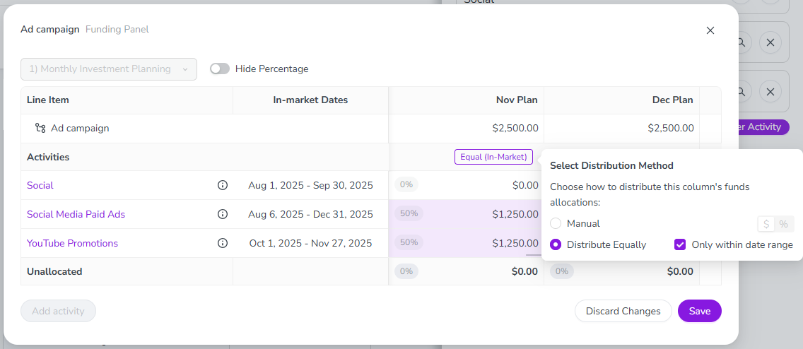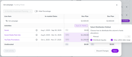 Optional date-based auto-allocation: If you have set date ranges on your budget columns, you can set Distribute Equally to allocate funds only to activities whose in-market dates fall within the column’s date range. This ensures funds are distributed only to activities relevant to that timeframe.